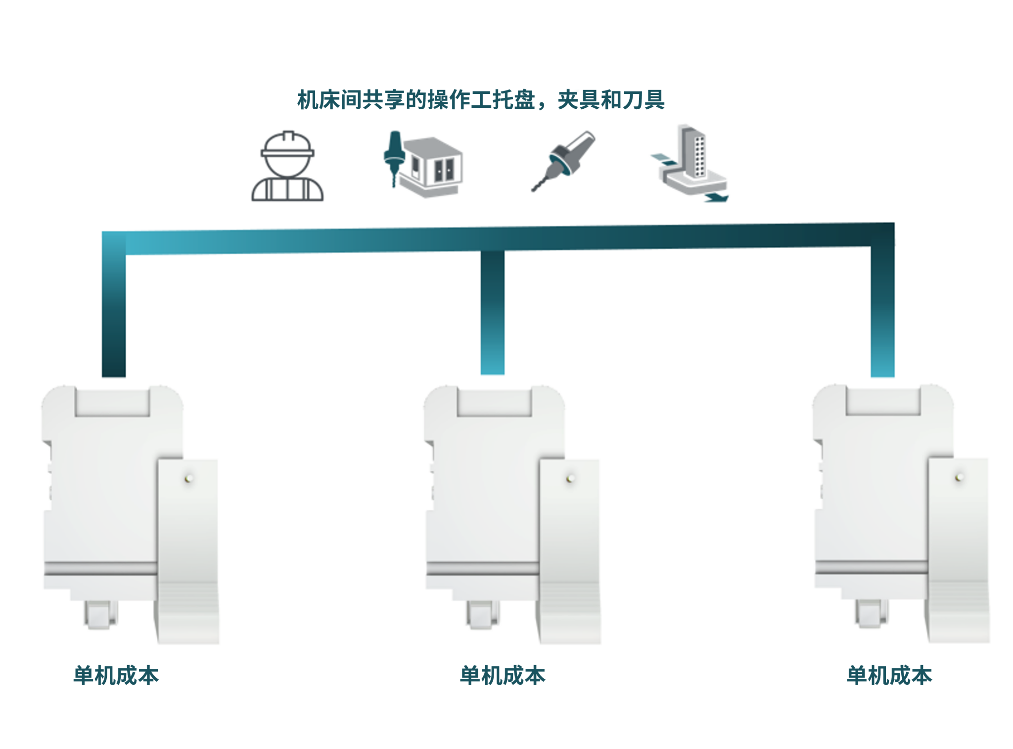 在柔性自动化系统中,订单共享于各台有能力加工的机床。生产资源:操作工,托盘,夹具和刀具共用于各台机床——这意味着托盘,夹具和刀具不会成倍增加,一名操作工可以兼顾多台机床,工件的生产成本也随之降低。