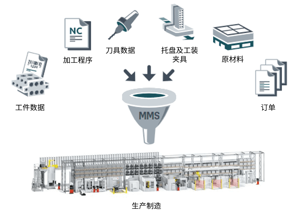 MMS可以管理自动化生产中全部的生产资源。当您导入工件、夹具、NC程序、刀具和物料数据,MMS便能基于生产订单将信息传递至机床,并集中处理全部的信息数据。